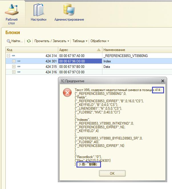 2. A more serious problem that was the message such as "In the description of the root block table 00 00 67 97 00 A0 contains invalid characters."