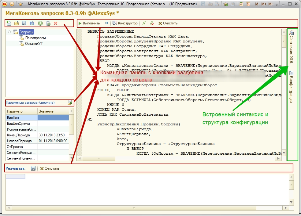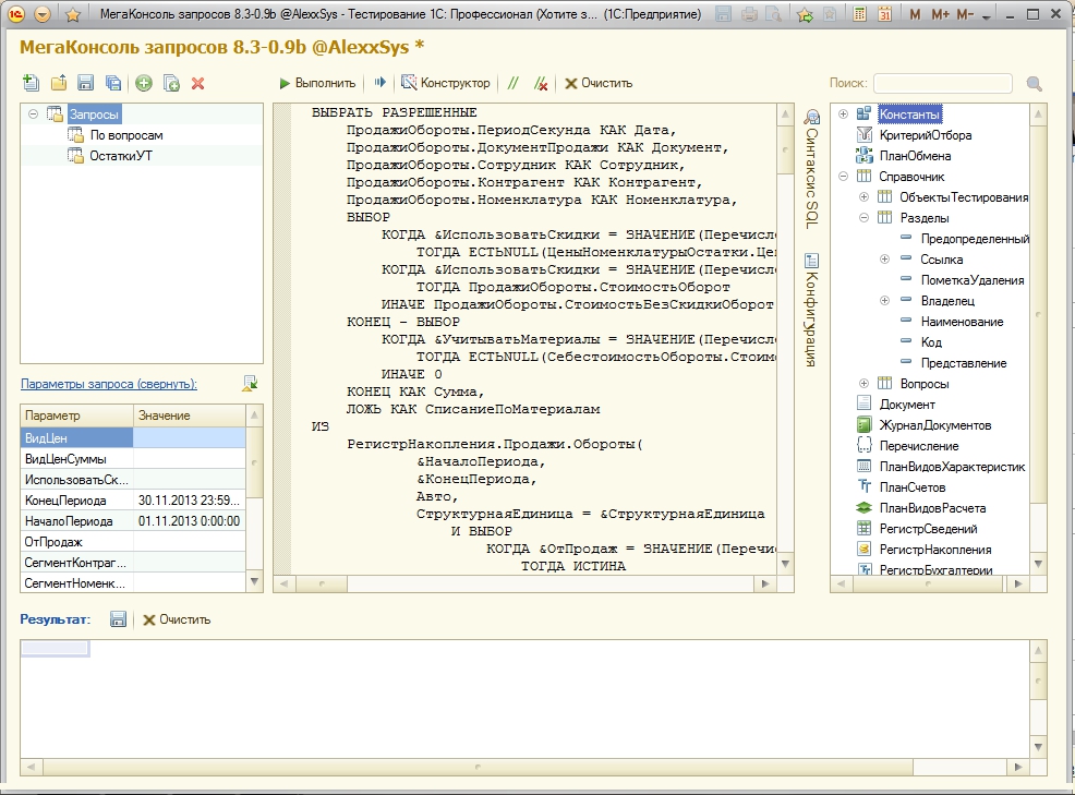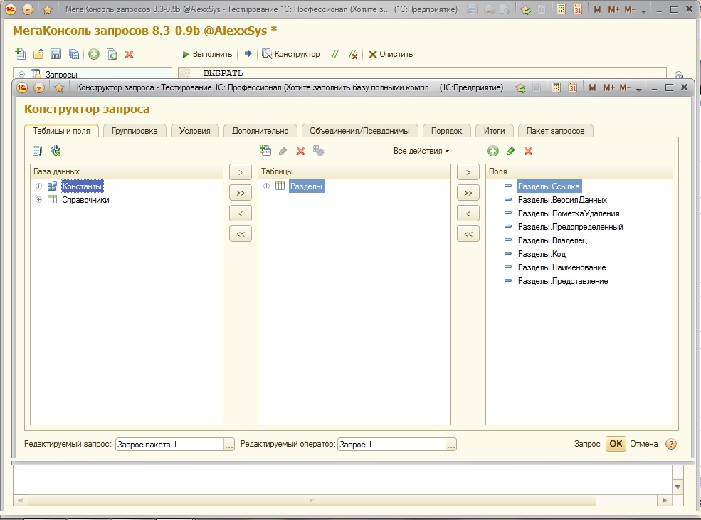 - Built-in mechanism that generates the configuration structure, with all the virtual tables (SrezPoslednih, Remains, turnover, etc.). When you select any object or props, the way it is transferred to the query text.